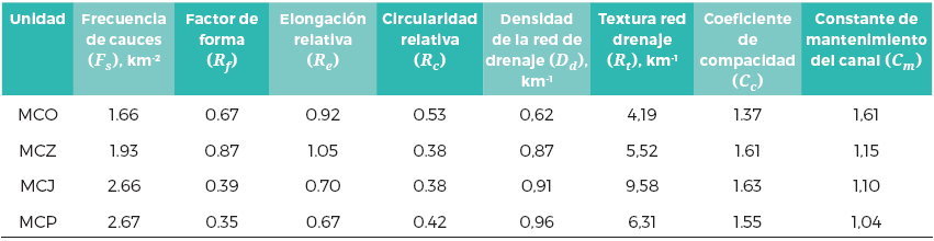 3.1.2.6. Textura de la red drenaje (Rt): Este parámetro da una idea cualitativa del espaciamiento relativo entre cauces en la red de drenaje. Está determinada de manera significativa por la capacidad de infiltración de la cuenca (Horton, 1945) y determina la geomorfología. Los valores de textura de la red de drenaje se muestran en el cuadro 5. Strahler (1957) clasificó la textura en muy gruesa, cuando Rt < 2; gruesa, cuando 2 ≤ Rt < 4; moderada, cuando 4 ≤ Rt < 6; fina, cuando 6 ≤ Rt < 8 y muy fina, cuando Rt > 8. La MCJ exhibe una textura muy fina con Rt = 9,68, la MCP muestra una textura fina con Rt = 6,31, la MCZ y MCO tienen una textura moderada. Así, las MCP y MCJ exhiben una textura fina relacionada con cauces relativamente más espaciados y suelos poco permeables donde la escorrentía es alta. Mientras que las MCZ y MCO muestran una textura moderada relacionada con cauces moderadamente espaciados y suelos más permeables.