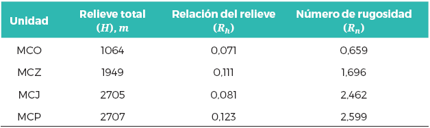 3.1.3.3. Número de rugosidad (Rn): Es un potencial indicador de factores amenazantes de una cuenca, especialmente de peligros relacionados con movimiento de agua y movilización de sedimentos, erosión de pendientes y erosión fluvial (Alcántara-Ayala & Goudie, 2010). Los valores de Rh para las MC se listan en el cuadro 6. Los valores fluctúan entre 0,659 (MCO); 1,696 (MCZ); 2,462 (MCJ) y 2,599 (MCP). Los valores altos de rugosidad implican una topografía accidentada y que la MC es propensa a erosión del suelo (Lama et al., 2015). En regiones montañosas, los valores mayores a 1, pero menores a 10, están relacionados con procesos geomórficos fluviales con una posibilidad de incidencia intermedia. Mientras que valores menores a 1, se relacionan con procesos geomórficos relacionados con movimientos (Alcántara-Ayala & Goudie, 2010) de masas con una posibilidad de incidencia alta.