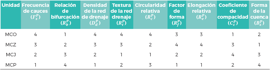 La caracterización morfométrica realizada ha mostrado la relevancia que tienen los aspectos lineales del área y del relieve para caracterizar el comportamiento hidro-topográfico de las MC estudiadas. Sin embargo, para la priorización solo se consideró los parámetros morfométricos relacionados con aspectos lineales y del área, porque los aspectos del relieve ya incluyen intrínsecamente aspectos lineales y del área y se quiso usar la menor cantidad de PM.