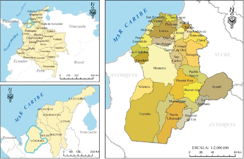 La división político-administrativa del departamento de Córdoba es de treinta municipios y su población al año 2005 era de 1.396.764 habitantes, con una densidad de 58,24 h/km2 (Departamento Administrativo Nacional de Estadística, 2005) (Figura 1).