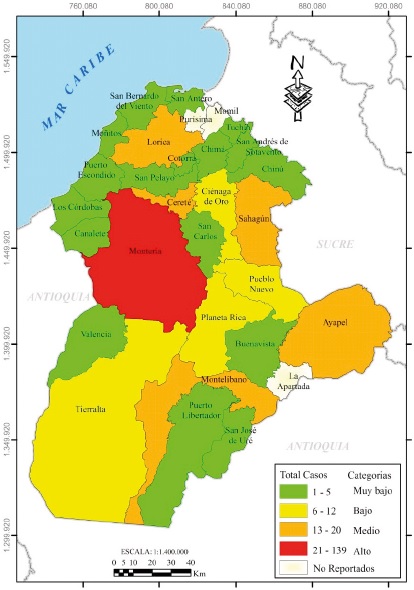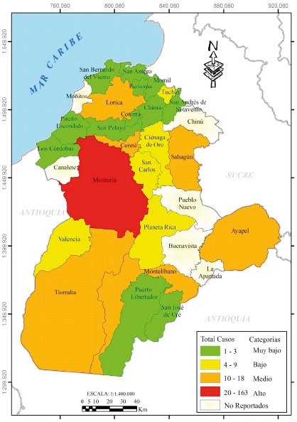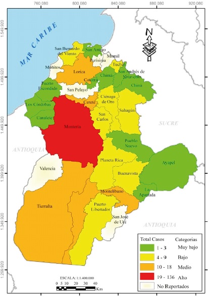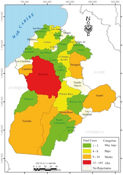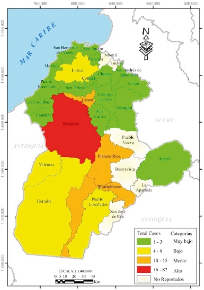 Entretanto, en el sur (Tierralta, Puerto Libertador, Valencia) y parte del norte (Lorica), se observaron valores bajos entre 4 y 9 casos; mientras en el oriente, con un sólo municipio (Ayapel) y el norte en general, fueron registrados datos menores entre 1 y 3 casos (categoría muy bajo) en territorios con predominancia rural (zona costanera, bajo Sinú en áreas de resguardos indígenas y del complejo cenagoso del mismo nombre, y de sabanas). Es de anotar que para el 2008, algunas localidades no tenían información, lo cual se mantuvo en los años posteriores.
