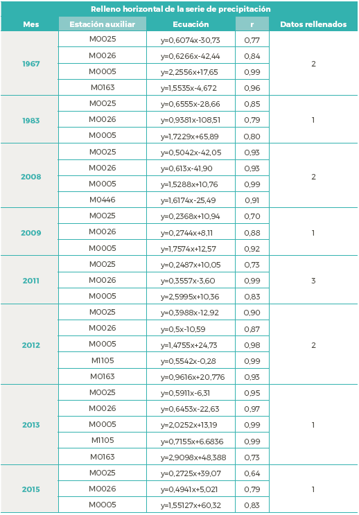 Para realizar el relleno de datos de la serie de tiempo de precipitación, primero se determinó la cantidad de datos faltantes. La metodología de la regresión lineal simple se aplicó tomando los promedios mensuales de todos los años de manera vertical, en el caso de la ausencia de los datos mensuales de todo un año en específico como indica la metodología utilizada por Carrera et al. (2016), cuando los datos faltantes fueron pocos meses de un año, se realizó una regresión lineal tomando los datos de manera horizontal de cada año faltante. Por lo cual fue necesario analizar si el dato faltante se podía estimar mediante una regresión que tomara los datos verticalmente u horizontalmente, teniendo en cuenta el formato en el que se recopiló la información. Se realizó una regresión lineal para cada dato faltante con cada una de las estaciones auxiliares. A las estaciones M1105, M0163 y M0446 se las usó solamente para el relleno de años en específico, debido a que fueron instaladas en una época más reciente que la estación M0162 de Chone. Se determinó el coeficiente de correlación de cada regresión lineal. Para la estimación finalmente se usó la ecuación de regresión lineal de aquella estación que tuviera el coeficiente de correlación con un valor más alto, debido a que esta herramienta es recomendada por la OMM (2011).