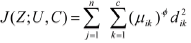 (1)donde Z = {z1, z2, ..., zn} son los datos a ser clasificados, U = [µik], es la matriz de partición difusa de Z, C = [c1, c2, ..., cc] es el vector de centros (centroides) o patrones de las clases a determinar, d2 es la distancia al cuadrado entre ik, y [1,) es un exponente de ponderación que determina el grado de difusividad de los clases resultantes.