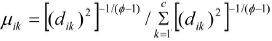 La función de membresía µ del i-ésimo objeto al k-ésimo clúster en el algoritmo k-means difuso ordinario emplea la distancia d utilizada para la similitud, y el exponente difuso para determinar la magnitud de difusividad:
