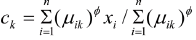 (2)Una vez determinadas las intensidades de pertenencia, se calculan los centroides de las clases (ck) por medio de la siguiente ecuación: