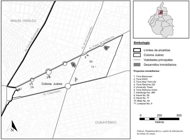 La creciente actividad inmobiliaria en la colonia Juárez se da de diferentes maneras, y está teniendo como consecuencia la revalorización del suelo y el desplazamiento de la población de menores ingre- sos que allí habitaban. Este fenómeno es parte de un proceso de gentrificación que está sucediendo en la zona central y en espacios selectivos de la Ciudad de México, tales como la colonia Roma, Condesa, Polanco, entre otras (Aguayo, 2016; Delgadillo y Olivera, 2014; Oropeza et al., 2018; Salinas, 2013). No obstante, en la colonia Juárez se pueden diferenciar dos tipos de intervenciones inmobilia- rias: a) Desarrollos inmobiliarios de gran magnitud llevados a cabo sobre Paseo de la Reforma. Aquí se han realizado inversiones de capital nacional e internacional en distintas modalidades en los últi- mos años, ya sea a través de las FIBRAS o mediante la agrupación de inversionistas. Se ha construido una fuerte oferta de oficinas, usos comerciales y usos mixtos, los cuales incluyen vivienda dirigida a población de ingresos altos. Es un tipo de actividad inmobiliaria a gran escala que está teniendo serias consecuencias en dicha colonia. b) Desarrollos inmobiliarios al interior de la colonia. Estos son desarrollos de vivienda de menor escala que los realizados sobre Paseo de la Reforma. Se están generando edificios de vivienda completamente nuevos, y también se están remodelando y reden- sificando edificios antiguos de valor patrimonial, intensificando el uso de suelo habitacional.