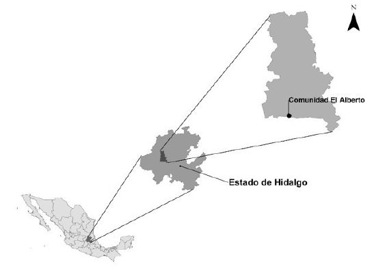 El estudio se realizó en la localidad denominada El Alberto, en el estado de Hidalgo, en la zona central de México (figura 1). Se encuentra a una altitud media de 1740 m s. n. m., posee un clima semiseco, con rangos de temperatura entre los 12 ºC y los 20 ºC, y un rango de precipitación promedio de entre los 300 mm y los 1100 mm (Instituto Nacional de Estadística y Geografía, 2009). El tipo de suelo dominante es el Leptosol y el Phaeozem, con una vegetación de tipo matorral espinoso (González, 2012). Los pobladores de la comunidad de El Alberto pertenecen al grupo indígena otomí o hñahñu, siendo el otomí la lengua más utilizada (González, Rangel-Villafranco y Cárdenas-Camargo, 2016). Dicho grupo, en el estado de Hidalgo, es el segundo con más integrantes, con aproximadamente 115.869 individuos, que representan el 31,87% del total de hablantes de esta lengua indígena en la entidad (Gobierno del Estado de Hidalgo, 2018).
