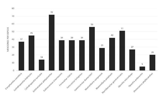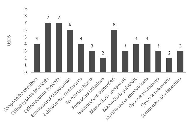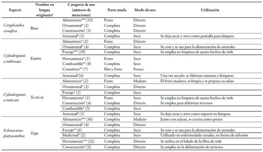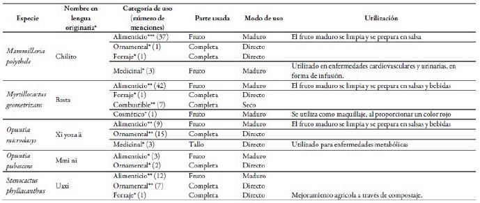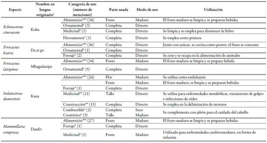 Se registraron un total de 14 especies, distribuidas en 10 géneros, siendo los géneros Cylindropuntia y Opuntia los mejor representados, con 2 especies. Las especies identificadas fueron: Coryphantha cornifera, Cylindropuntia imbricata, Cylindropuntia tunicata, Echinocactus platyacanthus, Echinocereus cinerascens, Ferocactus histrix, Ferocactus latispinus, Isolatocereus dumortieri, Mammillaria compressa, Mammillaria polythele, Myrtillocactus geometrizans, Opuntia microdasys, Opuntia pubescens y Stenocactus phyllacanthus; cabe destacar que las 14 especies tienen un nombre en otomí. El número de menciones totales fue de 515, reconociéndose 9 diferentes usos: alimenticio, ornamental, forraje, medicinal, combustible, cosmético, fabricación de herramienta, elaboración de artesanía y material para la construcción. De los 60 usos/intensidad, el 60% (36) se ubicaron en la categoría de baja intensidad, el 23,3% (14) en la categoría media, y el 16,7% (10) en la categoría alta (tabla 1).