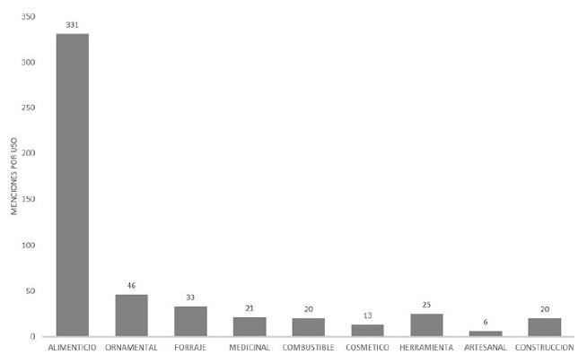 El uso alimenticio es el más mencionado en este estudio y es el que se presenta en la mayoría de las especies, posiblemente como reflejo de intentar cubrir una de las necesidades más básicas. Se reporta la utilización principalmente de frutos, además de tallos y flores, que no solo son aprovechados de forma directa sino que complementan la gastronomía local, ya sea como saborizantes o como especias. La alimentación es complementada por la crianza de animales de traspatio, como cabras, que a su vez proporcionan una fuente segura de carne y leche, los cuales tienen que ser alimentados, lo que provoca que se busquen fuentes óptimas para la elaboración de forrajes apropiados.