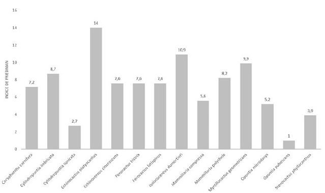 De acuerdo con su versatilidad de usos, destacan la Cylindropuntia tunicata y la Cylindropuntia imbricata, que presentan 7 usos, además del Echinocactus platyacanthus y el Isolatocereus dumortieri, con 6 usos, y solo 2 especies presentaron 2 usos (Ferocactus latispinus y Opuntia pubescens), el resto presentó entre 3 o 4 usos (figura 4). El mayor valor de IF fueron los que obtuvieron el Echinocactus platyacanthus, el Isolatocereus dumortieri y el Myrtillocactus geometrizans, con 14, 10,9 y 9,9, respectivamente (figura 5).