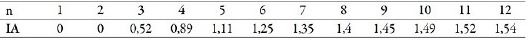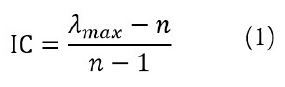 Finalmente se verifica la consistencia de la matriz de comparaciones pareadas. La matriz A es consistente si aij.ajk = aik para i,j,k = 1,2,…,n.. Para validar la consistencia razonable de los juicios en la matriz de comparación por pares se calcula el índice de consistencia (IC ) (ecuación 1) y la razón de consistencia (RC ) (ecuación 2). La razón de consistencia (RC ) se calcula a partir de un índice de consistencia aleatorio (IA ), que varía de acuerdo con el tamaño de la matriz A (tabla 3). La matriz se considera consistente si RC < 0,1; en caso contrario, se considera inconsistente y se aplica la corrección de consistencia planteada por Saaty (T. L. Saaty, 2003).