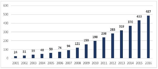 La energía eólica se ha convertido en una opción real y comercialmente atractiva para generar energía eléctrica y por ello, en una de las de mayor crecimiento, como se puede observar en la figura 1. Este crecimiento fue impulsado principalmente por la adopción de políticas energéticas que buscan favorecer y establecer objetivos claros con respecto a la producción de las energías renovables, así como por los procesos de innovación en las compañías fabricantes de aerogeneradores para reducir sus costos y mejorar su rendimiento. En el 2016, se alcanzó una capacidad eólica instalada cercana a los 487 GW. Según datos de la World Wind Energy Association (WWEA), para el final del 2016 más de 90 países tenían proyectos comerciales de energía eólica y 29 tenían en operación más de 1 GW (WWEA, 2017). Asia, Europa y América del Norte presentaron los mayores crecimientos en el sector, con un 53 %, 23,2 % y 16,2 %, respectivamente. China, Estados Unidos y Alemania fueron los países con mayores adiciones. El crecimiento en Latinoamérica fue del 6,5 %; en ocho países se instalaron más de 3,5 GW (REN 21, 2017).