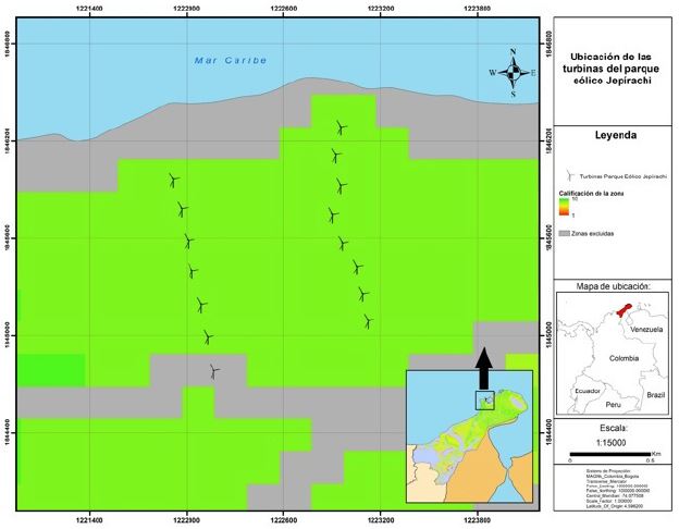 En Colombia existe un gran potencial eólico, de acuerdo con mediciones de la velocidad del viento realizadas por el Instituto de Hidrología, Meteorología y Estudios Ambientales (Ideam) e investigaciones realizadas anteriormente: en la costa Caribe, principalmente en el departamento de La Guajira y en algunas zonas en Santander, Boyacá y Huila (Pinilla, 2008). Sin embargo, en el 2015 la participación de la energía eólica en el mercado energético colombiano era del 0,1 % (Ministerio de Minas y Energía de Colombia, 2015). En Colombia, el primer y único parque eólico en funcionamiento conectado al Sistema interconectado Nacional (SIN) es el Parque Eólico Jepírachi. Este se encuentra ubicado en el departamento de La Guajira, en el municipio de Uribia. El parque es un proyecto piloto de Empresas Públicas de Medellín (EPM) para el aprovechamiento de la energía eólica en el departamento de La Guajira (EPM, 2010).