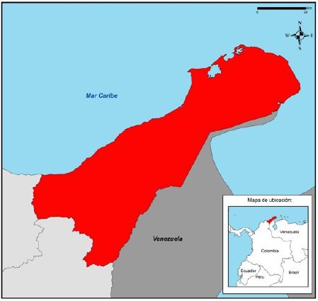 La Guajira es uno de los 32 departamentos de Colombia. Está ubicado al noreste del país, en la región Caribe, por lo que cuenta con línea costera en el océano Atlántico (figura 2). Con un área de 20.848 km2, es el vigésimo quinto departamento más extenso de Colombia y representa un 1,76 % de la superficie del país. El área se encuentra comprendida entre las latitudes 10º 23’ N y 12º 28’ N y las longitudes 71º 06’ W y 73º 39’ W. La Guajira limita al norte con el océano Atlántico, al oriente con la República Bolivariana de Venezuela, al occidente con los departamentos de Cesar y Magdalena y al sur con la República Bolivariana de Venezuela y el departamento de Cesar. La Guajira tiene una población proyectada a 2017 de 1.012.926 habitantes (Departamento Administrativo Nacional de Estadística, 2011).