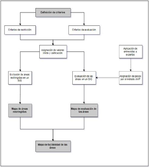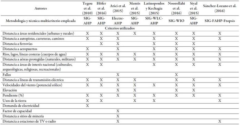 En la literatura, la integración de los SIG con los MDMC ha sido empleada en diferentes estudios para determinar la ubicación de proyectos de energías renovables. Podemos mencionar como ejemplos recientes los trabajos de Tegou, Polatidis y Haralambopoulos (2010); Aydin, Kentel y Duzgun (2010); Uyan (2013); Atici, Simsek, Ulucan y Tosun (2015); Latinopoulos y Kechagia (2015); Siyal et al. (2015); Sánchez-Lozano, García-Cascales y Lamata (2016); Höfer, Sunak, Siddique y Madlener (2016), y Noorollahi, Yousefi y Mohammadi (2016). Estos estudios presentan diferentes metodologías de acuerdo con el tipo de energía o la zona de estudio. En general, los resultados obtenidos corresponden a mapas de la distribución de zonas factibles para instalar turbinas de viento. Las zonas potenciales son elegidas conforme a criterios de restricción y evaluación y su importancia. La selección de estos criterios debe ser analizada cuidadosamente para cada área de estudio y los resultados obtenidos dependen directamente de los criterios seleccionados. Todo estudio de selección y evaluación de áreas con potencial eólico debe tener en cuenta, además de los impactos ambientales, aspectos técnicos y económicos (Tegou et al., 2010).