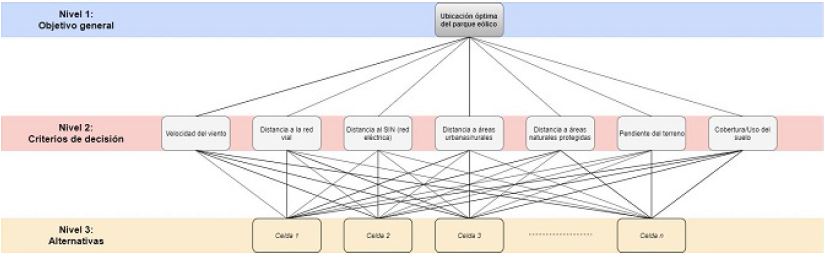 Como los criterios de evaluación no tienen la misma importancia, es necesario definir el nivel de importancia de cada uno. El método AHP fue el usado para asignar los pesos a cada criterio. En la figura 4, se muestra la estructura jerárquica del problema de decisión. Esta es una estructura de tres niveles. En el primer nivel, se encuentra el objetivo general del proceso, el cual consiste en encontrar la ubicación óptima para instalar parques eólicos en La Guajira (Colombia). En el segundo nivel, se encuentran los criterios que afectan la decisión, es decir, los criterios de evaluación seleccionados anteriormente: velocidad del viento, distancia a la red vial, distancia al SIN (red eléctrica), distancia a zonas urbanas/rurales, distancia a áreas naturales protegidas, pendiente del terreno y cobertura/uso del suelo. En el tercer nivel, se encuentran las alternativas de solución, las cuales son los sitios o celdas en donde es posible ubicar aerogeneradores.