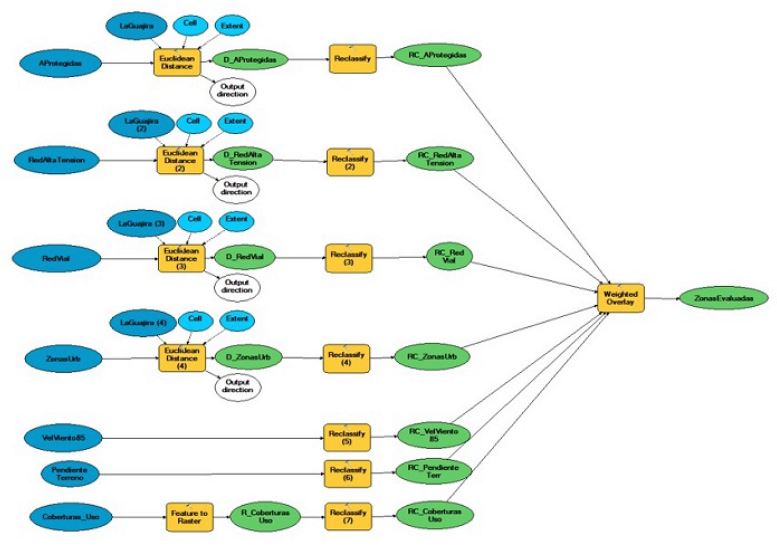 Luego de establecer los criterios de restricción y de evaluación, se procedió a realizar los análisis en un SIG. El software ArcGIS de ESRI (v. 10.3.1) fue utilizado para el modelamiento y análisis espacial. La zona de estudio se dividió en celdas de 200 m x 200 m, con el fin de asegurar el correcto posicionamiento de un aerogenerador en una celda. En la tabla 4, se muestran los criterios de restricción establecidos para el área de estudio, además se muestran las distintas fuentes de información cartográfica y los valores límites fijados para estos. Para la exclusión de las áreas restringidas, a partir de cada criterio de restricción se crearon rasters, que posteriormente se reclasificaron haciendo uso de lógica booleana, de modo que se le asignó un valor de cero (0) a las celdas que se encuentren dentro de la zona restringida y un valor de uno (1) a las que se encuentren fuera de dicha zona. Finalmente, se creó un mapa de áreas restringidas al multiplicar los rasters correspondientes a los criterios de restricción. Las celdas con un valor de uno (1) en todos los rasters representan el área total disponible para instalar aerogeneradores en el departamento de La Guajira.