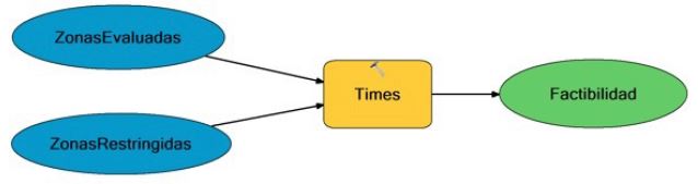El mapa de factibilidad de áreas fue creado a partir de los dos mapas generados por los modelos presentados anteriormente (mapa de áreas restringidas y mapa de evaluación de las áreas). El modelo de geoprocesamiento utilizado se muestra en la figura 6. Además, se definió un índice de factibilidad con cuatro clases (tabla 6).