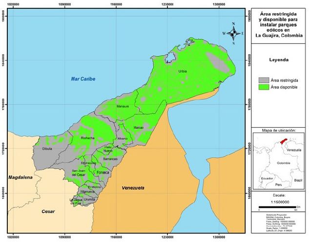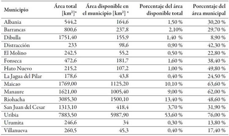 En la figura 7, se muestra el mapa final de áreas restringidas y disponibles. Este fue calculado a partir de cada capa de restricción. Luego de la exclusión de las zonas restringidas, aproximadamente el 54,2 % del área del departamento de La Guajira permanece disponible para el desarrollo de proyectos de energía eólica. Esto corresponde aproximadamente a 11.300 km2 del total de los 20.848 km2 del departamento. En la tabla 7 se muestra el área disponible por municipio. Los municipios de Uribia, Maicao y Manaure son los que cuentan con mayor área disponible, mientras que Dibulla, Urumita y Villanueva poseen una menor área disponible para desarrollar proyectos de energía eólica. Del área disponible total, el 53,6 % (5987,9 km2) se encuentra en el municipio de Uribia, que corresponde al 76 % del área municipal. Aunque este es el municipio de mayor extensión territorial, el alto porcentaje de área disponible se debe a que es una zona de relieve plano a ligeramente ondulado, semidesértica, árida y de escasa vegetación. El municipio de Dibulla tiene solo un 8,9 % de su área disponible, debido a la presencia de la Sierra Nevada de Santa Marta, que, como se dijo anteriormente, es un área natural protegida, que además tiene zonas de gran elevación y pendiente.