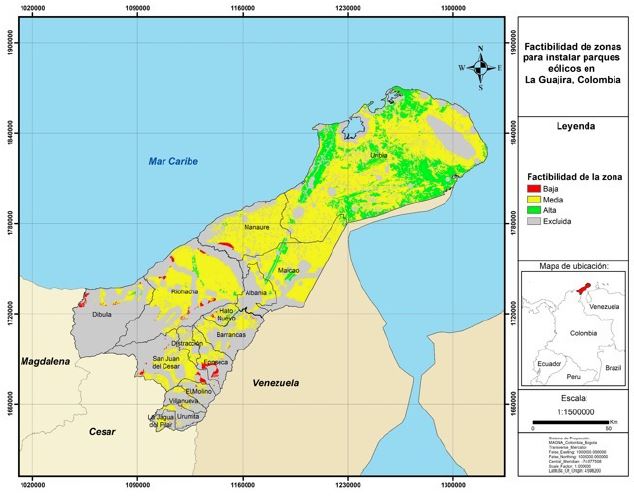 De acuerdo con el mapa de factibilidad, el mayor porcentaje de zonas con alta factibilidad o idoneidad se encuentran en la Alta Guajira, en el municipio de Uribia. Esto debido al hecho de que en estas zonas se presentan las mayores velocidades promedio del viento y están alejadas de poblaciones urbanas y áreas naturales protegidas. Adicionalmente, estas zonas son semidesérticas y de escasa vegetación, condiciones que favorecen la implementación de proyectos de energía eólica. La mayor parte del área disponible se catalogó como zonas de factibilidad media. Estas se encuentran distribuidas en todo el departamento. Las zonas de media factibilidad en el norte del departamento (Alta Guajira) se favorecieron por altas calificaciones en los criterios de velocidad del viento, distancia a zonas urbanas, distancia a áreas naturales protegidas y cobertura del suelo; aunque se vieron castigadas por la lejanía de las vías y las líneas de transmisión. Hacia el sur del departamento (Media y Baja Guajira), a pesar de que se presentan bajas velocidades de viento, se vieron favorecidas por la cercanía a la infraestructura existente (red eléctrica y red vial). Las zonas de baja factibilidad se encuentran hacia el sur del departamento. En estas se presentan bajas velocidades del viento. Además, existe una alta presencia de zonas urbanas y áreas naturales protegidas, por lo cual se vieron castigadas.