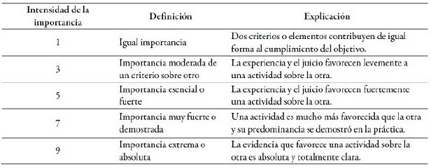 En la tabla 1 también se puede notar que el proceso de análisis jerárquico (AHP, por sus siglas en inglés) fue el MDMC más utilizado en los trabajos revisados. El AHP es un método diseñado para resolver problemas complejos que implican múltiples criterios u objetivos (Tegou et al., 2010). En la aplicación de este método, quien toma la decisión debe comparar la importancia de un criterio con respecto a otro. Con esto se obtiene una jerarquización de las alternativas posibles. Para aplicar el AHP se requiere: a) definir el objetivo del problema, así como los criterios y las alternativas; además, se requiere estructurar el problema de decisión como una jerarquía; b) crear una matriz de comparación por pares, en donde se compara la importancia de un criterio frente a otro; c) calcular el vector de prioridades que indica la importancia relativa de los diferentes criterios, y d) validar la consistencia de los resultados (R. W. Saaty, 1987; T. L. Saaty, 1980). La comparación por pares es la base fundamental del AHP. De acuerdo con T. L. Saaty (1980), para n criterios es posible construir una matriz A=[aij], con i,j =1,2,…,n. El valor de cada aij corresponde a la importancia relativa del criterio Ci (fila i ) sobre el criterio Cj (columna j ), según la escala fundamental propuesta por Saaty (tabla 2). Cuando i=j, el valor de aij será igual a 1 ya que estamos comparando un criterio con el mismo.