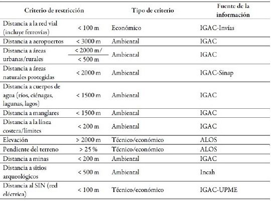 La metodología seguida durante el desarrollo de este trabajo se ilustra en la figura 3. La definición de esta metodología se hizo con base en la revisión de la literatura y la legislación colombiana. El primer reto era establecer los criterios de restricción y de evaluación de las zonas con potencial eólico y fijar los valores límites de estos. Los criterios de restricción corresponden a los que limitan el desarrollo de proyectos eólicos, mientras que los criterios de evaluación definen la idoneidad de una zona para el desarrollo de estos proyectos. En primera instancia, se consideraron los criterios más relevantes utilizados en los estudios revisados (tabla 1). Sin embargo, aunque algunos de estos criterios pueden ser utilizados a nivel mundial, como la velocidad del viento, la pendiente del terreno o la elevación, se incluyeron algunos de acuerdo con la legislación colombiana, por ejemplo, la protección de los manglares. En Colombia, no existe una legislación explícita para la ubicación de parques eólicos, por ello nos basamos en la normatividad ambiental vigente.