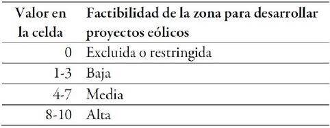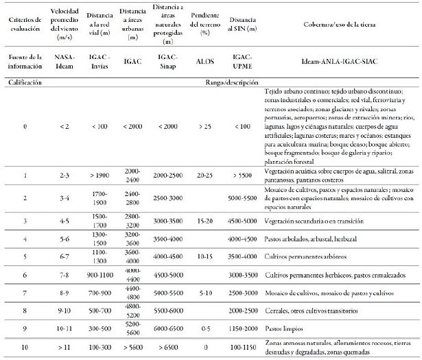 Para evaluar y establecer las áreas óptimas para el desarrollo de proyectos eólicos en La Guajira, se definieron los criterios mostrados en la tabla 5. Para los criterios que dependen de distancias, se crearon rangos de distancia y luego se le asignó una calificación a cada rango basado en la revisión de la literatura. Los criterios que no dependen de distancias (velocidad del viento, pendiente del terreno y uso/cobertura del suelo) solo fueron reclasificados de acuerdo con la tabla 5. La velocidad promedio del viento de un área se considera como uno de los criterios más importantes en el momento de elegir la ubicación de un parque eólico. Este es un criterio clave al momento de estimar el potencial eólico y, por consiguiente, el rendimiento económico del proyecto. Para este criterio, se creó un mapa de velocidad promedio del viento, a una altura de 85 m, a partir de datos de la National Aeronautics and Space Administration (NASA) (2011) y de mediciones de estaciones meteorológicas en La Guajira realizadas por el Ideam. La distancia a la red vial es también uno de los criterios más utilizados. Con el fin de reducir los costos de construcción de un parque eólico, estos deberían estar ubicados cerca de las vías. En los estudios revisados, las áreas más alejadas de las vías se consideraron menos viables para construir parques eólicos. Además, las vías deben ser lo suficientemente amplias para el óptimo transporte de las estructuras del aerogenerador (Tegou et al., 2010). Para el área de estudio, se consideraron las vías primarias y secundarias, de acuerdo con la clasificación del Instituto Nacional de Vías (Invías) (Ministerio de Transporte, 2008). Con el objetivo de reducir los costos asociados a las pérdidas debido a largas distancias de transmisión y el cableado, los parques eólicos deben situarse en las proximidades de la red eléctrica. Los parque eólicos con más de 10 MW instalados normalmente se pueden conectar a la red de alto voltaje (110kW) y generalmente se requiere construir una nueva subestación (Hau, 2013). Los rangos de distancia y calificación para este criterio se fijaron basados en la revisión de la literatura y la Resolución n.º 90708 (Ministerio de Minas y Energía de Colombia, 2013), que reglamenta las distancias mínimas de proyectos al Sistema Interconectado Nacional (SIN).