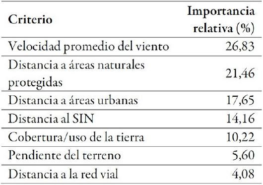 La importancia relativa de los criterios de evaluación se muestra en la tabla 8. De acuerdo con los expertos que formaron parte de las entrevistas, los criterios más importantes al momento de seleccionar zonas para instalar parques eólicos en Colombia son la velocidad promedio del viento (26,83 %), la distancia a áreas naturales protegidas (21,46 %) y la distancia a áreas urbanas (17,65 %). Estos resultados son similares a otros estudios, en cuanto que la velocidad promedio del viento es el criterio más importante. Sin embargo, la diferencia en la importancia relativa de estos criterios es menor. Esto se puede atribuir a la conformación del grupo de expertos. La distancia al SIN (14,16 %) y la cobertura/uso del suelo (10,22 %) les siguieron en orden de importancia. La pendiente del terreno (5,6 %) y la distancia a las vías (4,08 %) fueron considerados como los criterios menos importantes.