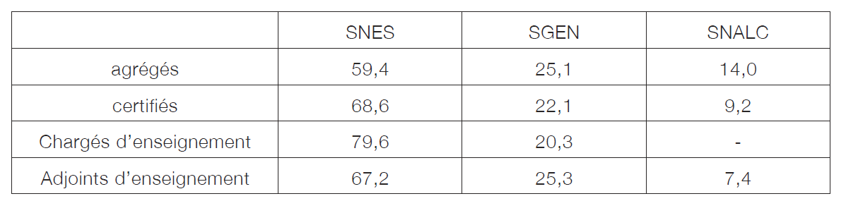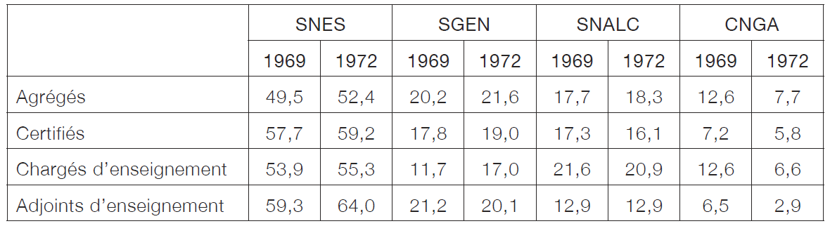 À la veille de Mai 1968, le paysage syndical français est marqué, pour les professeurs du second degré, par une opposition droite/gauche (Robert, 1995). Deux syndicats sont ancrés à gauche: le Syndicat national de l’enseignement du second degré (SNES) et le Syndicat général de l’éducation nationale (SGEN); un autre se veut apolitique, mais en pratique y adhèrent plutôt des enseignants de droite: le Syndicat national des collèges et des lycées (SNALC). Le SNES est membre de la Fédération de l’Éducation nationale (FEN), qui regroupe de multiples syndicats constitués sur une base catégorielle (syndicat des instituteurs, syndicat des chefs d’établissement, syndicat des professeurs du second degré, etc.). La majorité de la direction de la FEN est socialiste, mais depuis 1967 le noyau dur des dirigeants du SNES est proche des communistes (Dalançon, 2003)1. Pour sa part, fondé en 1937, le SGEN est à l’origine membre de la Confédération française des travailleurs chrétiens (CFTC). C’est un syndicat intercatégoriel, qui accueille des enseignants de la maternelle à l’université. Dans les années 1960, il regroupe essentiellement des chrétiens de gauche qui ont œuvré à la déconfessionnalisation de la CFTC - laquelle se transforme en Confédération française démocratique du travail (CFDT) (Singer, 1987). Le SNALC, enfin, se présente comme l’héritier du premier groupement corporatif des professeurs de lycée, créé en 1905. Entre les deux guerres, la plupart des professeurs de lycée adhéraient à ce groupement (Verneuil, 2015); mais lorsqu’il réapparaît après la guerre, la majorité des professeurs du second degré lui préfèrent désormais le SNES. À la veille de Mai 1968, celui-ci conserve une position dominante, voire hégémonique, dans toutes les catégories de professeurs du second degré, comme en témoignent les résultats des élections aux commissions administratives paritaires nationales (CAPN) de 19652