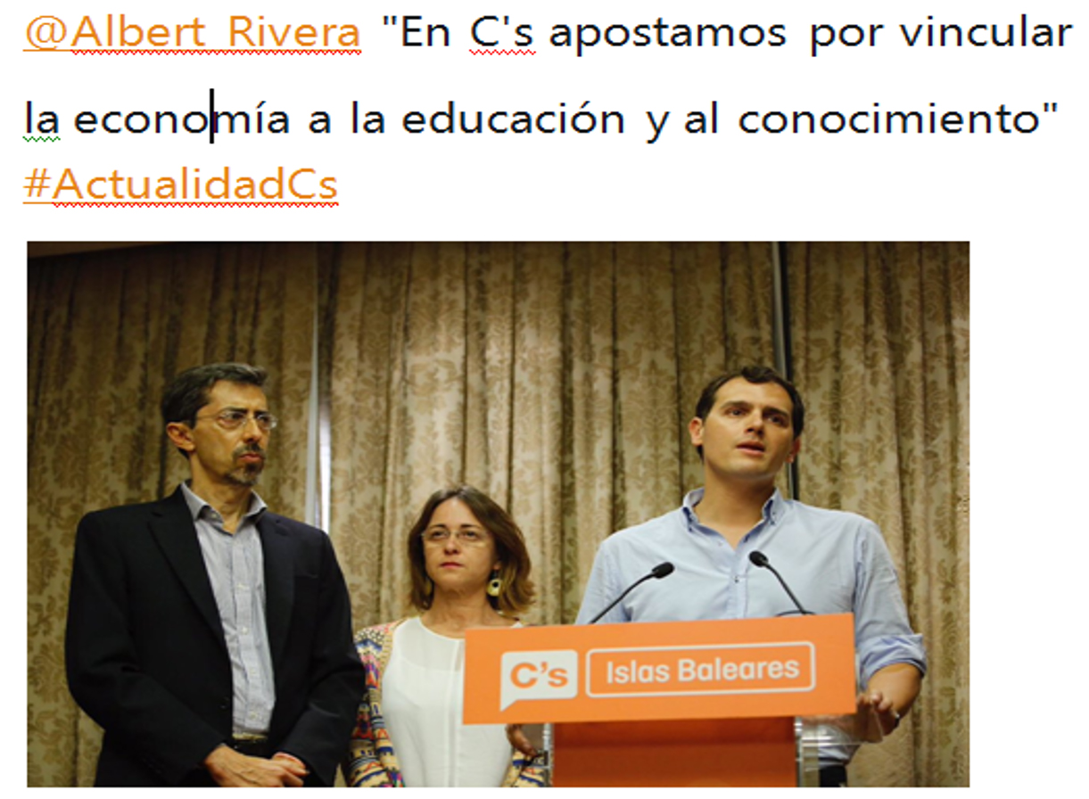 En él, como algo positivo de la perspectiva del partido, se rinde culto a la economía como medida práctica del funcionamiento de las grandes materias sensibles de cualquier gobierno, como lo es la educativa. Se hace, pese a que es la economía la que ha marcado todos los recortes en este campo que se han acometido desde el inicio de la crisis en la segunda mitad de la década de 2000. Para ofrecer importancia a esta reflexión dentro del tuit, Ciudadanos acompaña el texto con una imagen fija, que se muestra tras estas líneas. Una fotografía que refuerza esa auto-presentación positiva con la instantánea de un acto público en la que el líder del partido, Albert Rivera, ofrece una imagen cercana (en mangas de camisa), aunque con gesto serio, comprometido, como plasmación de lo que se quiere transmitir del partido. Ver Figura 9.