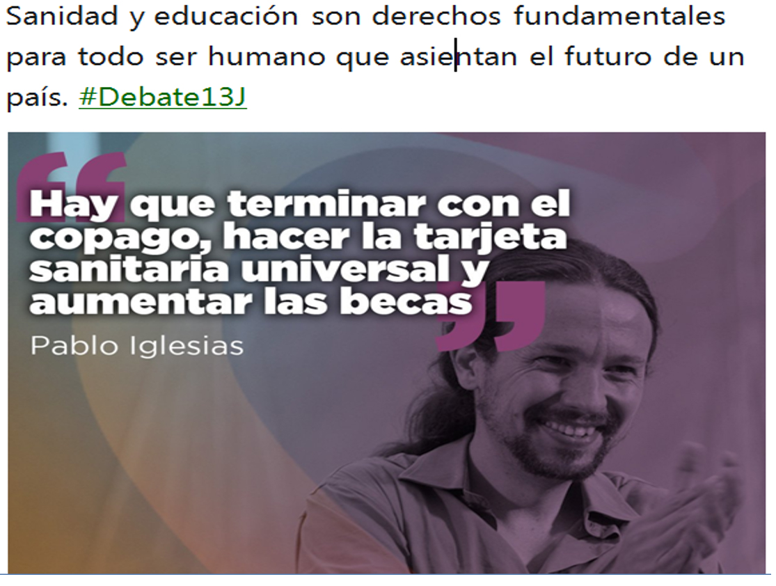 10.“Sanidad y educación son derechos fundamentales para todo ser humano que asientan el futuro de un país. #Debate13J”