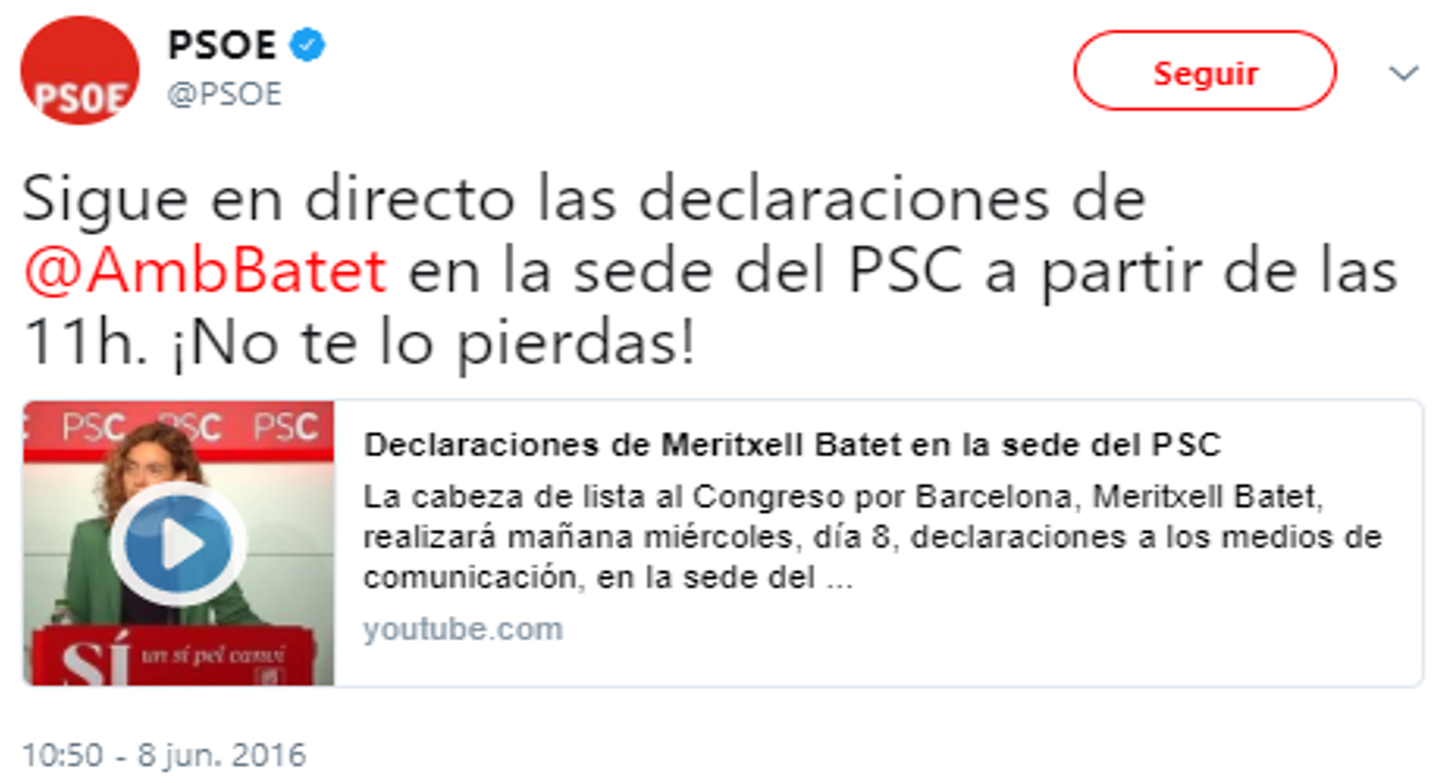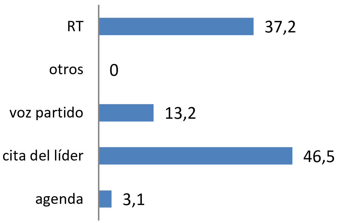 En tercer lugar, destacan los tuits que introducen la voz del partido. Nos referimos así a los que hablan de medidas políticas sin vincularlas explícitamente a declaraciones de sus líderes; son el grupo menos numeroso, lo que parece indicar que las cuentas no están siendo gestionadas, realmente, como perfiles de partido, sino como opción para reproducir todo lo referido a lo que han dicho, o a lo que concierne a sus candidatos. Además, muchos de estos tuits se completan con imágenes de los líderes, lo que distancia de los receptores la imagen del partido como institución, y la reduce a la cara del candidato. El PSOE (21%) es el partido que más recurre a este tipo de tuits, normalmente vinculados a trazos del programa electoral o a determinadas intenciones.