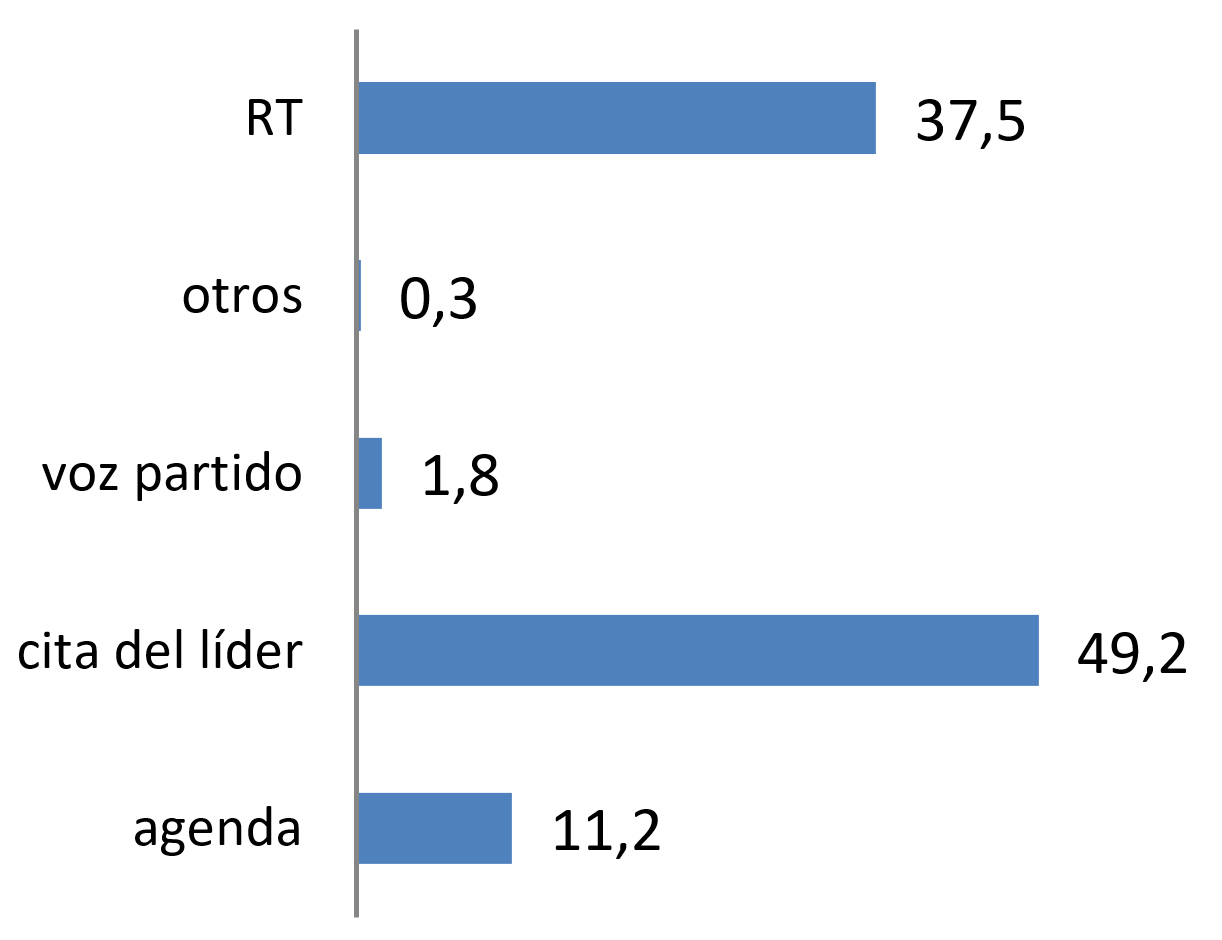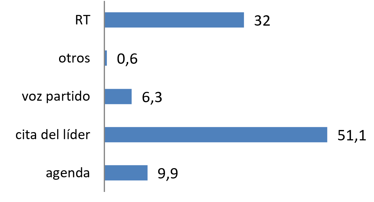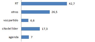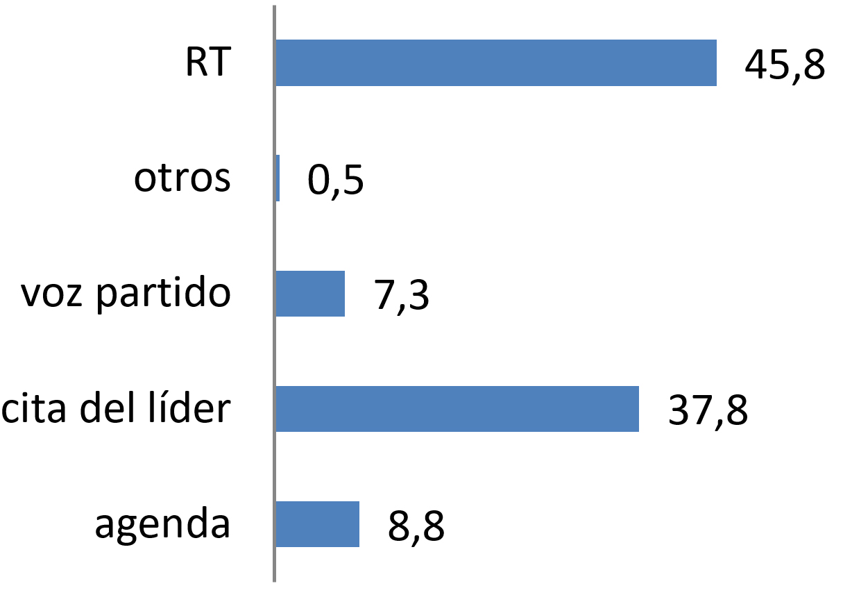 Estas diferentes funciones discursivas marcarán el uso político que se hace de Twitter. Así, en la cuenta de Podemos se dedican 318 mensajes a anunciar la agenda de actos (un 9,9% de los tuits) y 1.634 a citar las palabras de los líderes, sobre todo de Pablo Iglesias (860 menciones). Los mensajes que difunden la voz general del partido son 202 (el 6,3%). Los siguientes gráficos incluyen también los retuits, una forma de función subordinada, que suelen ser de la cuenta propia de los líderes de los partidos. Figura 4.