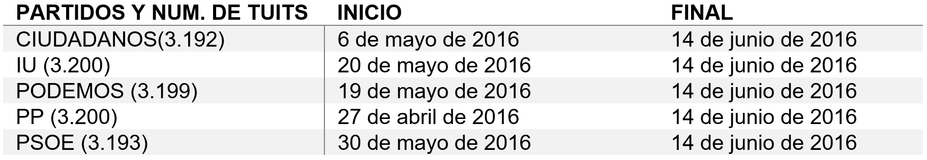Se ha tenido en cuenta para la revisión de la estructura discursiva de los tuits de los partidos, una muestra obtenida a partir de la aplicación twDocs. Tabla 1 La exportación de datos se realizó el 14 de junio de 2016, y cubría hasta los últimos 3.200 tuits de cada cuenta.