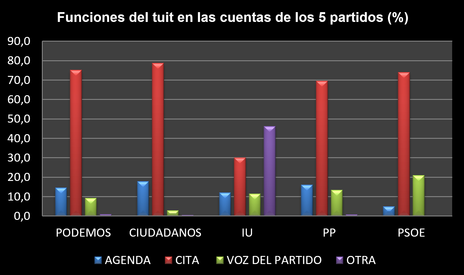 Revisamos ahora la función discursiva de los mensajes que se publican en cada perfil de partido. Se detectan tres tipos, a los que llamamos: tuits de cita, tuits de agenda y la voz del partido.