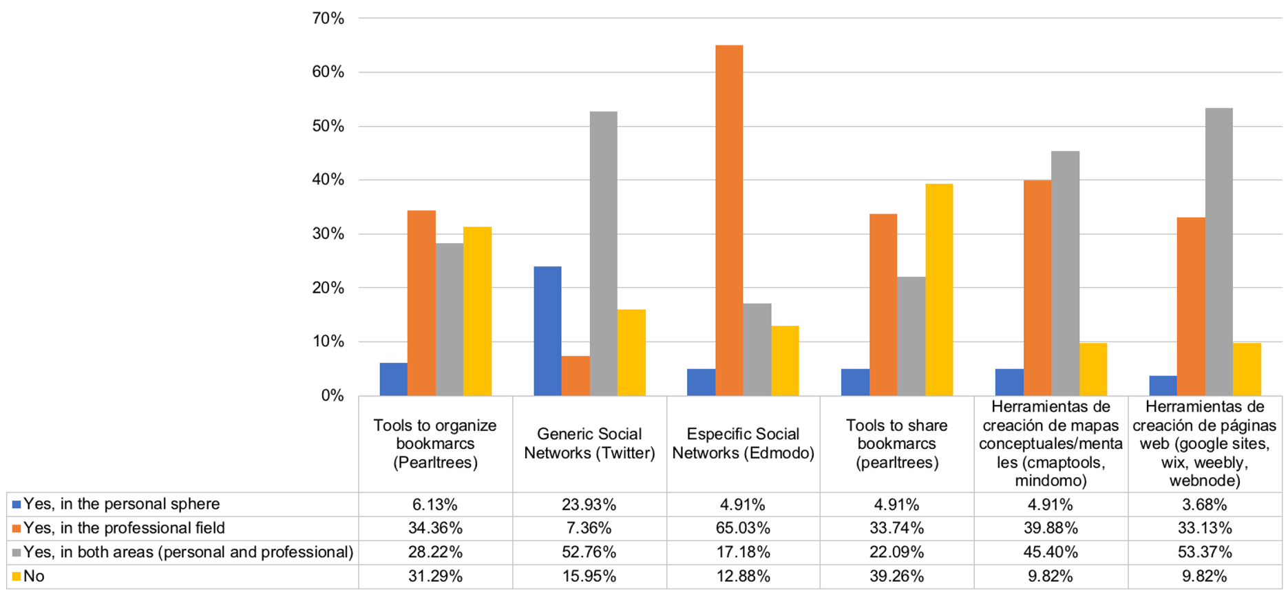 To assess the use of tools and procedures, information on the evolution of the personal use of web 2.0 tools was collected.