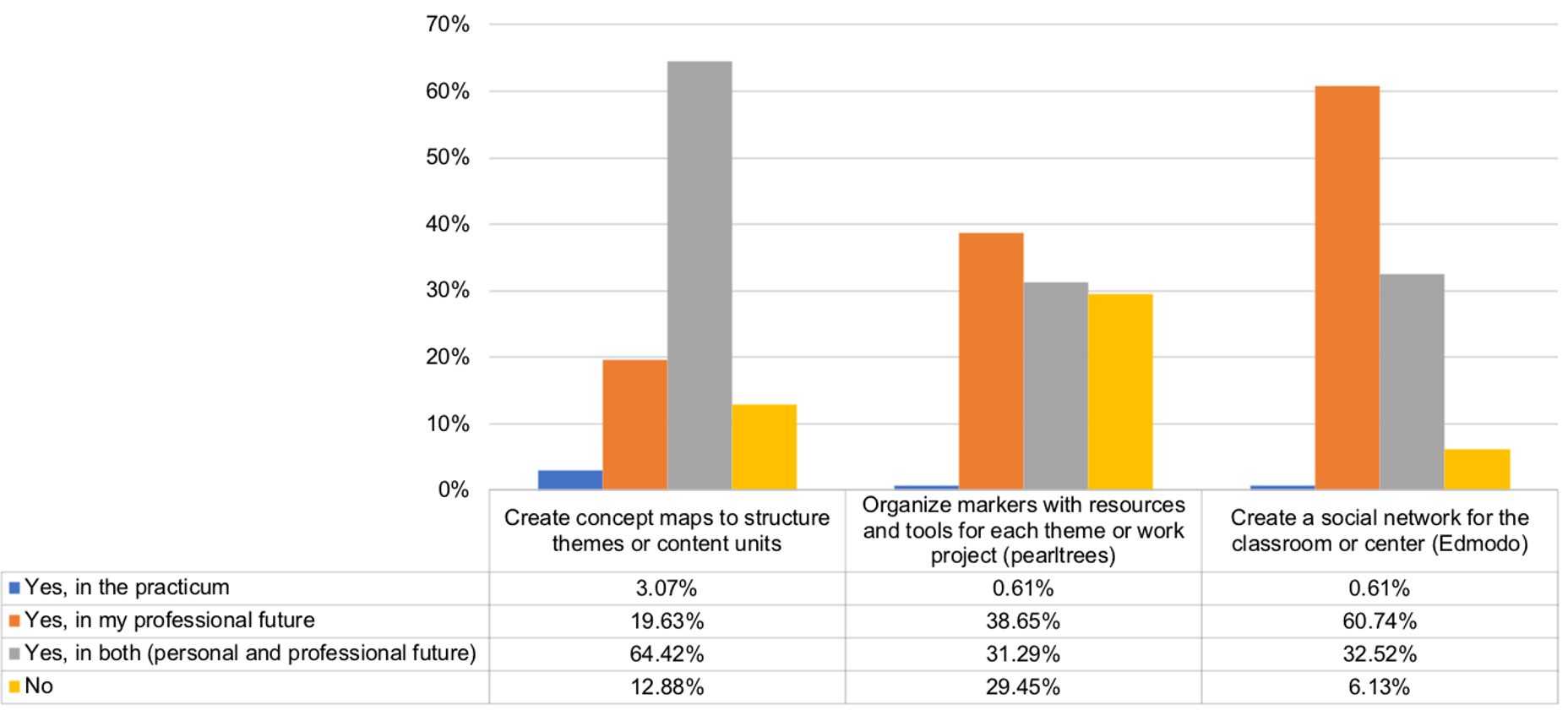Students were asked if they believed that they would use any of the didactic strategies in the course in their immediate professional future, or in their practicum. Over 60% of students believed they would use concept maps and social networks. However, 29.45% of students were not certain about the future use of Pearltrees (Figure 9).