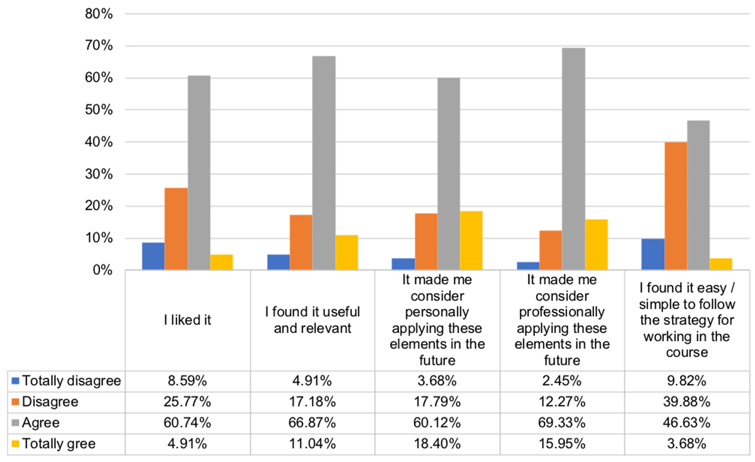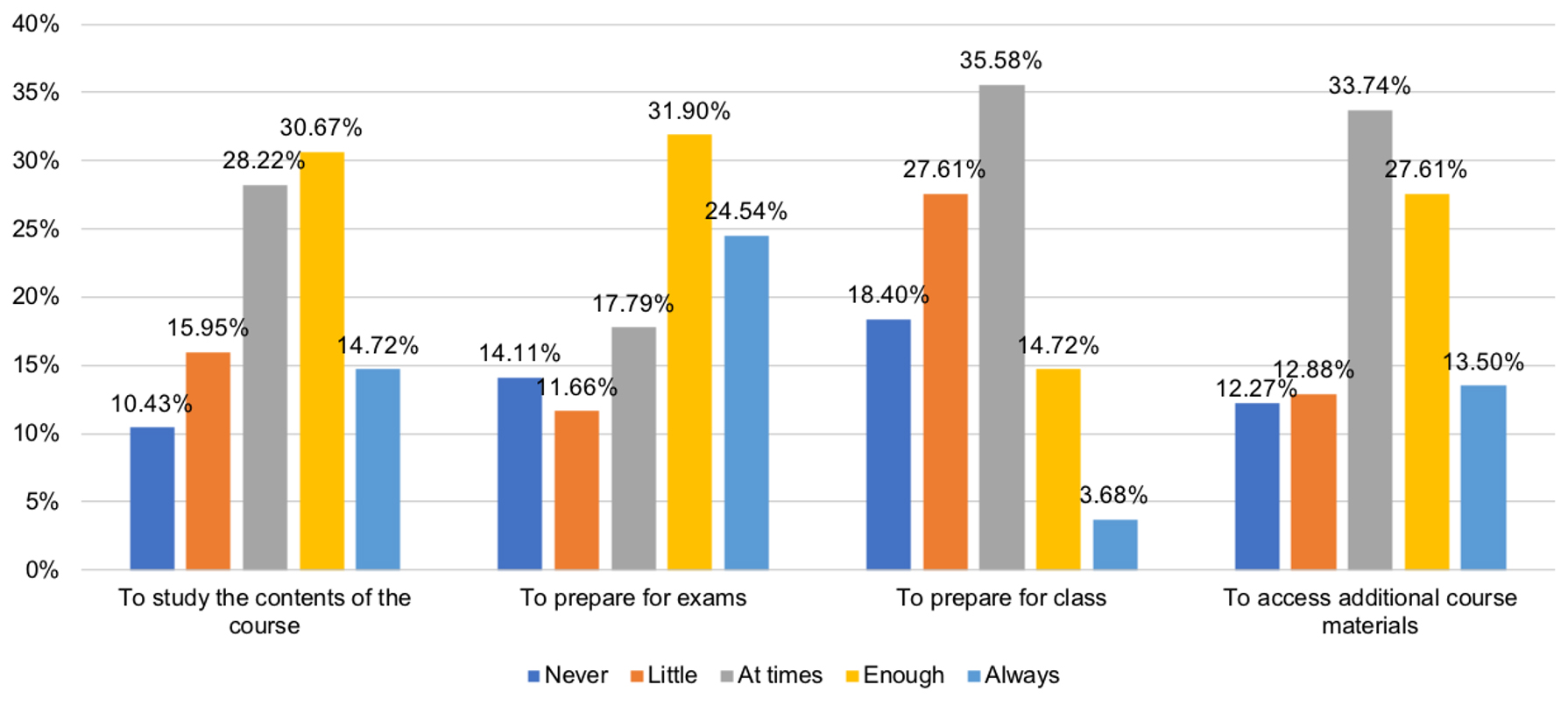This study’s primary data collection method consisted of an online student questionnaire to assess the overall strategy of the course, resource usage and information management. The questionnaire included 20 questions, combining multiple-choice and Likert 5-item scale questions (for assessment of attitudes from total disagreement to total agreement) on the perceived value and usage of the resources offered by the teachers, and the appropriation of tools for didactic processes relating to information management. Of the 241 students, 163 participated (68%) in the questionnaire.