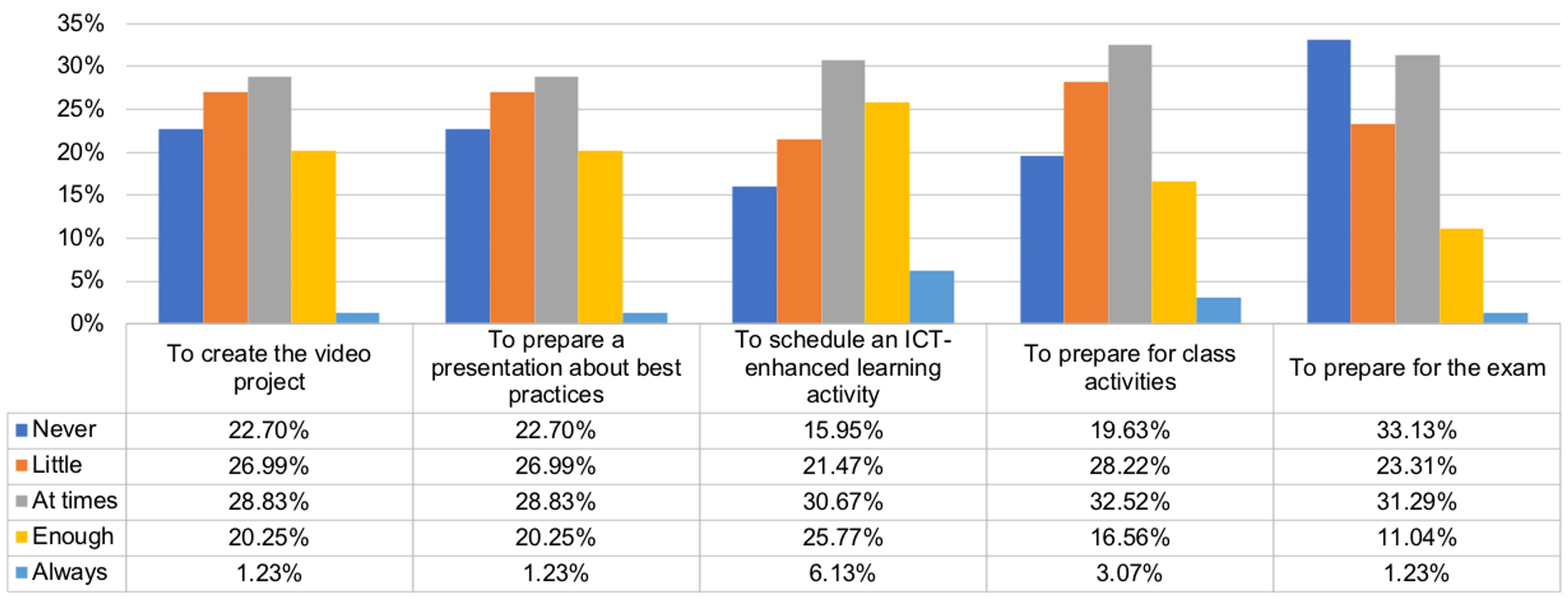 The didactic strategy required the student to develop, in cooperative groups, three work projects for practical use, which must be related to a school context. The students had to create a didactic sequence using technology, a short educational video, and present best practices for the integration of technology into schools. Students had access, via the virtual classroom, to guides and support material to assist their studying and planning. This strategy promoted finding collaborative solutions to complex problems, creation of knowledge, autonomy, individual and shared responsibility, idea and concept sharing, and critical and creative thinking.