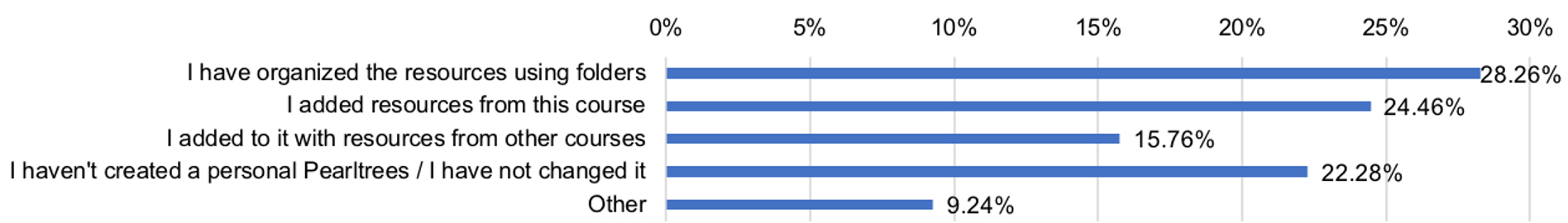 Students were asked how their use of Pearltrees evolved during the course, especially after the workshop introducing the tool. The majority of students continued to use Pearltrees, and some of them (15.76%) used it in other activities. Nearly a quarter of students said they did not create a personal Pearltrees or have not continued to use the Pearltrees created at the beginning of the course (Figure 6). In the Others option, 10 (out of 17) students claimed to have created a Pearltrees but did not use it, while 4 indicated that they used the Symbaloo tool instead to organize resources.