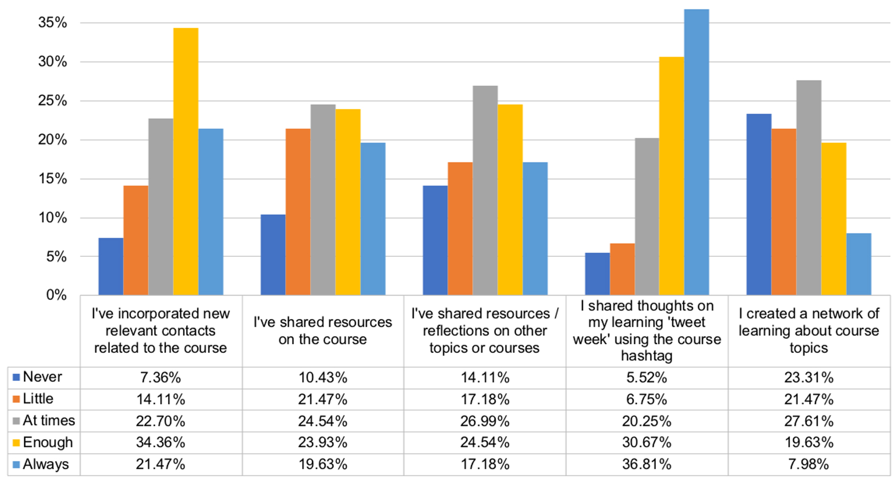 Students were also asked about how the use of their Twitter account evolved after the introductory workshop. Their responses reflected a high level of use of the Twitter tool for activities directly related to the course to share personal reflections, add new contacts and share resources on other topics or courses (Figure 7).