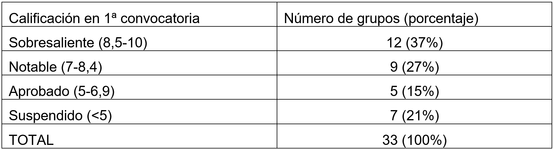 Como puede verse en la Figura 1, en primera convocatoria alrededor del 20% de los proyectos no superan los mínimos, mientras que un 37% son sobresalientes.