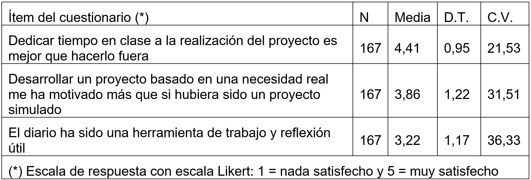 El proyecto ha supuesto un reto para los estudiantes y para el propio equipo docente que ha gestionado hasta 33 equipos de trabajo. Los alumnos agradecen que gran parte del trabajo se realice dentro el aula (el aspecto con el que mayor satisfacción demuestran) y para el profesorado resulta imprescindible trasladar la tutoría al aula con una matrícula de 180 alumnos (90 por grupo). Seguramente se requiere mayor coordinación entre las asignaturas del curso para que el esfuerzo se rentabilice entre las mismas y no se dediquen en exceso a una sola asignatura. Un porcentaje tan elevado de proyectos sobresalientes (37% que son unos 67 alumnos de los 180 matriculados) da idea del esfuerzo y dedicación que los estudiantes le han dado al proyecto.
