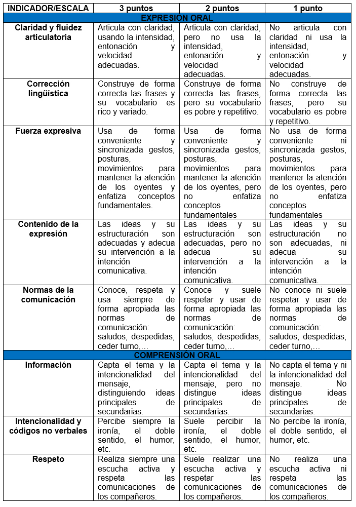 Rúbrica de destrezas orales: con el fin de medir el nivel de destreza de cada alumno relativa a la comunicación oral, tanto expresiva como receptiva. Para su confección se utilizaron como base los criterios de valoración de la comunicación oral expuestos en Prado (2014). Esta misma rúbrica se volvió a pasar en la fase analítica para contrastar los resultados obtenidos.