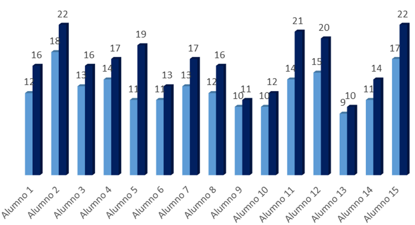 Una vez finalizado el proyecto, se volvió a pasar al alumnado la misma rúbrica diseñada y ejecutada previamente, con la intención de evaluar el desarrollo de desempeño alcanzado. Los resultados fueron concluyentes: la suma total pasó de los 190 puntos iniciales a 246 puntos tras la experiencia desarrollada y la media se situó en 16, 4 puntos frente a los 12,6, siendo el porcentaje de desarrollo del 29,47%. Esta progresión se produjo en todos los estudiantes -Figura 4-:
