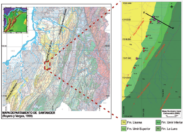 Izquierda: Mapa geológico de Santander (Royero y Vargas, 1999) con la ubicación de los sinclinales con cabeceo al norte en el piedemonte occidental de la Cordillera Oriental. derecha: Localización del corte geológico (A-A’) y los pozos seleccionados en este estudio (en forma de estrella) sobre el mapa geológico elaborado por CARBOANDES (2009).