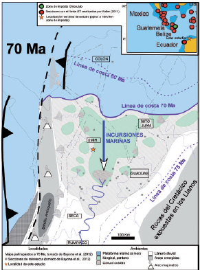 Mapa paleogeográfico a 70 Ma, localizando los sistemas de acumulación marino somero, marginal de llanuras y pantanos, y el fluvial, con la ubicación de las áreas emergidas al occidente (Cordillera Central) y oriente (Llanos). Note la migración al norte de las líneas de costa de 75, 70 y 60 Ma, documentando el proceso de progradación y relleno de la cuenca por sedimentos terrígenos. Mapa base y localidades tomado de Bayona et al. (2012). Mapa superior: Localización de la zona de impacto Chicxulub con respecto a la posición de la margen NW de Suramérica (tomado de Keller, 2011).