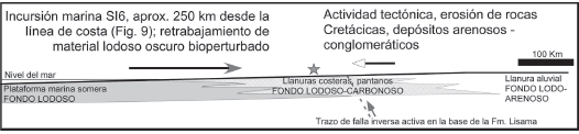 Perfil esquemático ilustrando la procedencia marina-marginal del material lodoso que suprayace la superficie SI6 y del material terrígeno grueso que se genera por la actividad estructural cercana a área fuente.