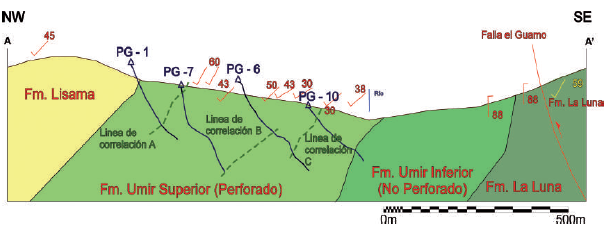Corte geológico (escala horizontal igual a la vertical) donde se proyectan los pozos PG-1, PG-7, PG-6 y PG-10. Un espesor de 548 m se calculó para el segmento superior de la Formación Umir y 276 m para el segmento de inferior, el cual no fue perforado.