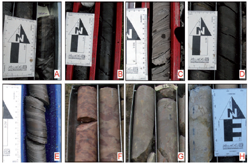 Litofacies representativas de la Formación Umir (A, B, C, D y E) y de la Formación Lisama (F, G y H). A. LoB, Lodolitas bioperturbadas. b. LoC, Lodolitas carbonosas. c. LiL, limolitas con laminación ondulosa paralela y lenticular; ArL, Arenisca muy fina laminación ondulosa y rizaduras. d. AcL, Arcillolita con laminación ondulosa y lenticular. e. LoL, Lodolitas con laminación ondulosa y lenticular. f. LoMtRj, Lodolitas moteadas rojas. g. LoM, Lodolitas macizas oscuras. H. ArM, Arenisca conglomerática maciza.